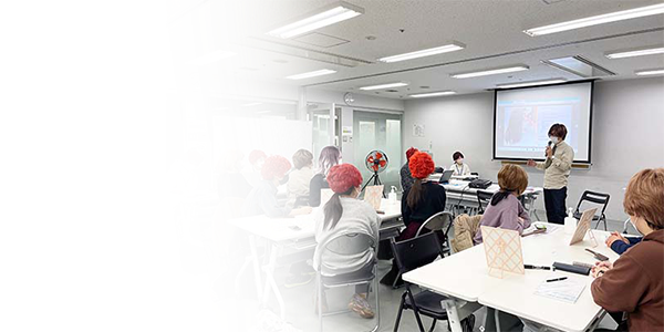株式会社アデランスのご協力により色とりどりのウィッグを用意し、代表の渡辺とともに参加者の皆さんもウィッグを着用したままで、2時間に及ぶプログラムを受けていただきました。