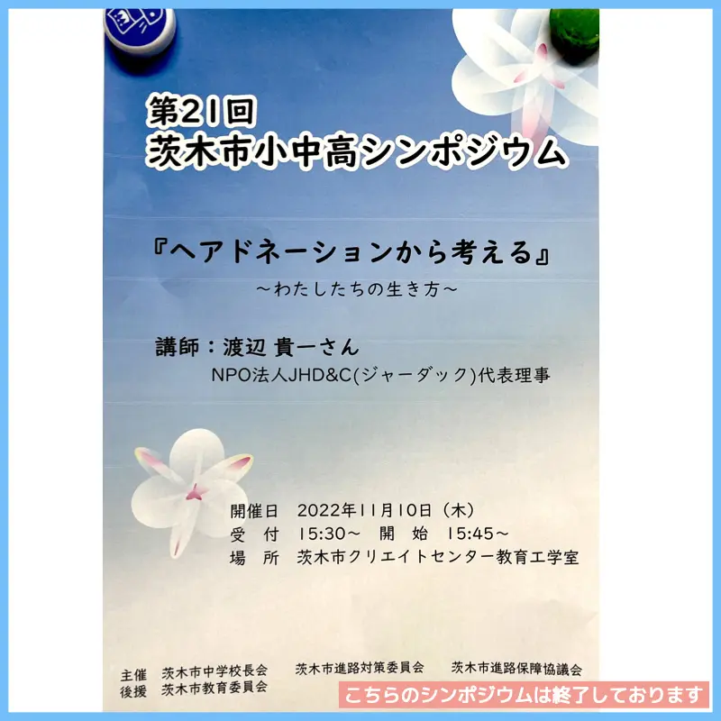 昨年11月、⼤阪府茨⽊市進路保障協議会などが主催する教職員向けのシンポジウム「第21回 茨⽊市⼩中⾼シンポジウム」にて、「ヘアドネーションから考えるわたしたちの生き方」と題し、JHD&C代表が講演させていただきました。