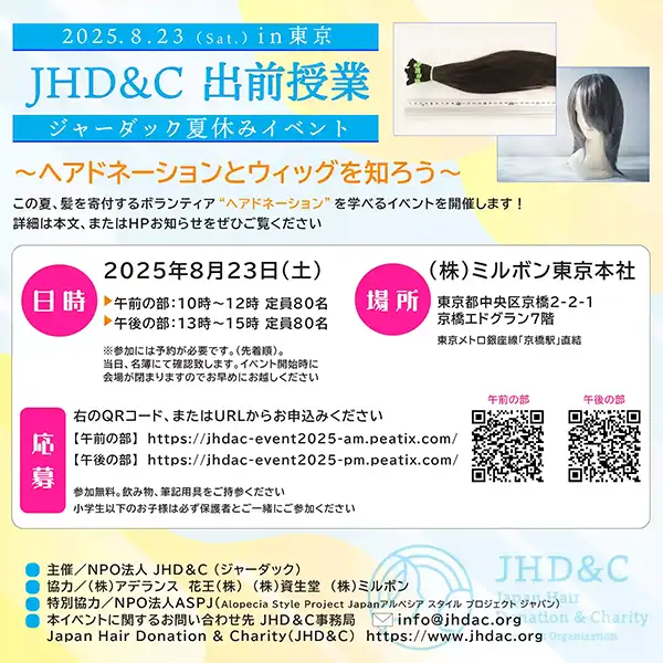 2025年8月23日(土)東京にて、夏休みイベント「JHD&C出前授業 in 東京2025 ~ヘアドネーションとウィッグを知ろう~ 」を開催しました。