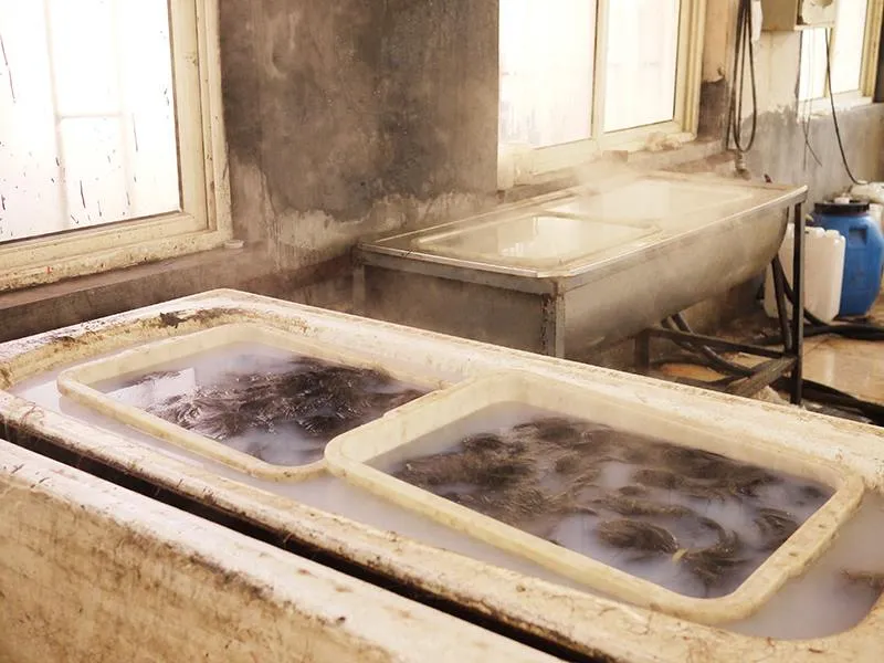 ここまでくると、薬品を使った髪の毛の処理はほぼ終盤です。酸性の薬品を使った廃水処理が気になり、質問したところ、廃水はタンクに溜めて、石灰と混ぜて中和し無害化した後、廃水処理業者に引き渡すとのことでした。